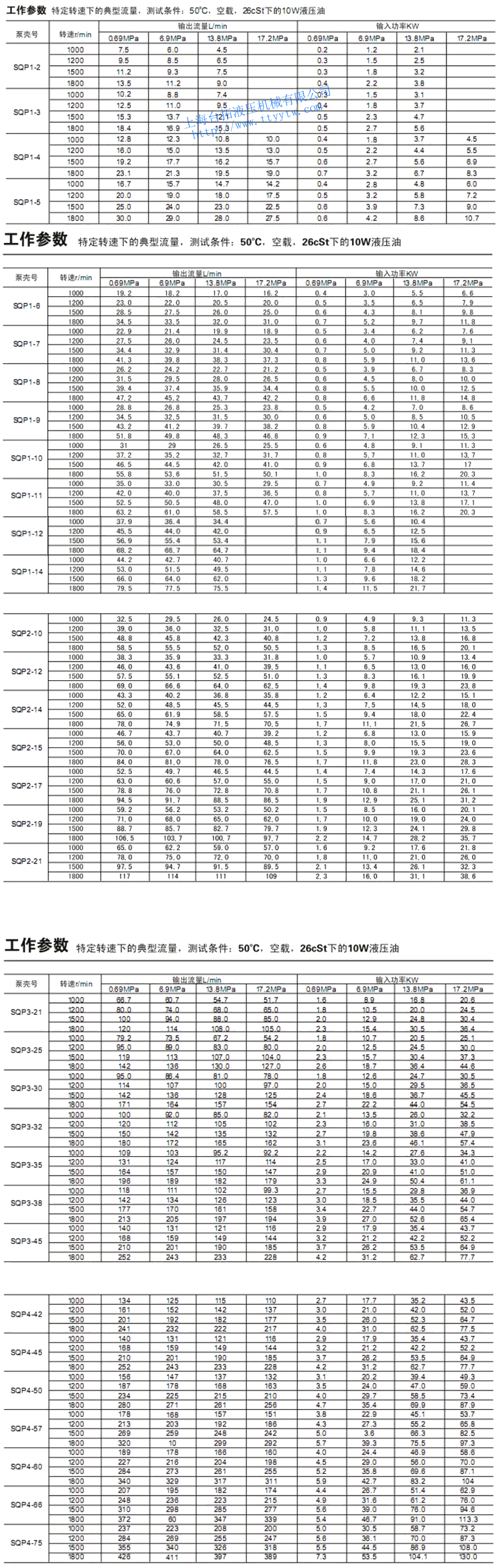 r/min使用抗磨液壓油或磷酸酯 使用水乙二醇液 使用油包水乳化液 最高壓力Mpa 最高轉(zhuǎn)速r/min 最高壓力Mpa 最高轉(zhuǎn)速r/min 最高壓力Mpa 最高轉(zhuǎn)速r/min SQP1 2 7.5 13.8 1800 13.8 1200 13.8 1200 600 3 10.2 4 12.8 17.2 17.2 5 16.7 6 19.2 7 22.9 8 26.2 9 28.8 10 31.0 11 35.0 12 37.9 15.7 15.7 14 44.2 13.8 13.8 SQP2 10 32.5 17.2 1800 17.2 1200 13.8 1200 600 12 38.3 14 43.3 15 46.7 17 52.5 19 59.2 21 65.0 SQP3 21 66.7 17.2 1800 17.2 1200 13.8 1200 600 25 79.2 30 95.0 32 100 35 109 38 118 45 140 SQP4 42 134 17.2 1800 17.2 1200 13.8 1200 600 45 140 50 156 57 178 60 189 66 207 75 237 備注:1、排量代號(hào)是在1200r/min和0.69Mpa(100psi)下的額定排量USgpm。2、最高壓力是0.5秒內(nèi),允許超過(guò)最高壓力10%的瞬間壓力。