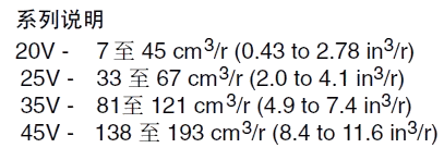 型號 排量代號 幾何排量ml/rev 使用抗磨液壓油或磷酸酯 使用水乙二醇液 使用油包水乳化液 最低轉速