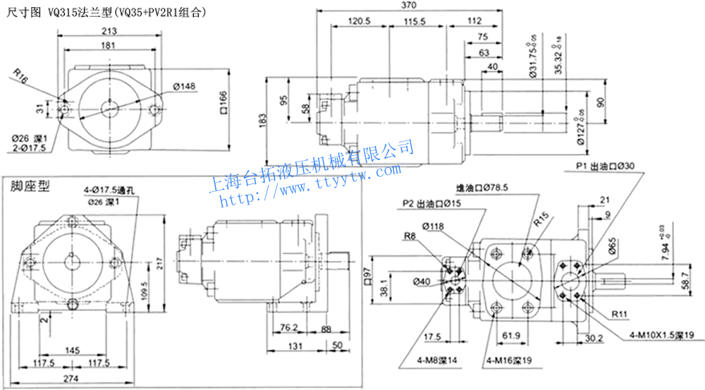 高壓雙聯定量葉片泵VQ215(VQ25+PV2R1組合)尺寸圖下載 高壓雙聯定量葉片泵VQ315法蘭型(VQ35+PV2R1組合)尺寸圖下載