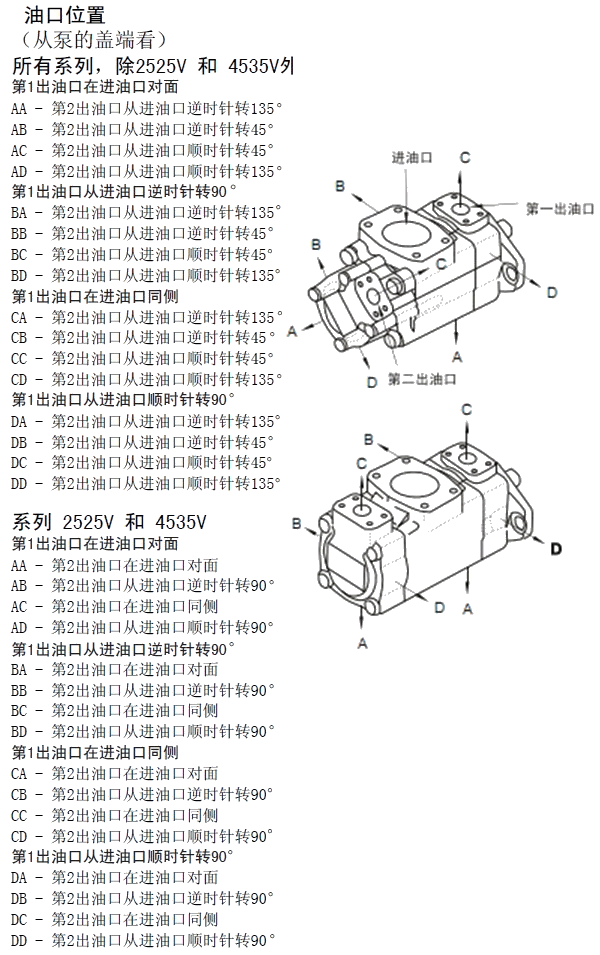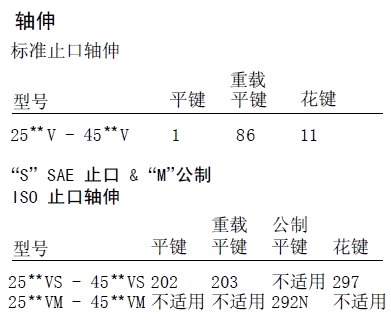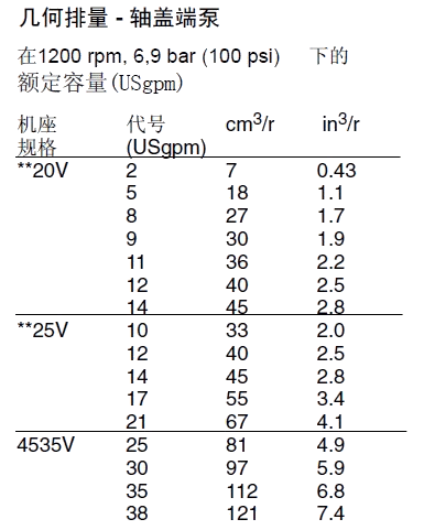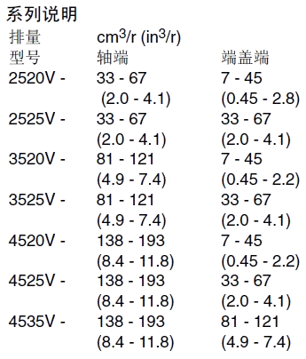 型號 最大幾何排量cm3/r 最高壓力bar 額定轉速r/min 2520V 67軸端 172 1800 45蓋端 207 2525V 67軸端 172 67蓋端 172 3520V 121軸端 172 45蓋端 207 3525V 121軸端 172 67蓋端 172 4520V 193軸端 172 45蓋端 207 4525V 193軸端 172 67蓋端 172 4535V 193軸端 172 121蓋端 172