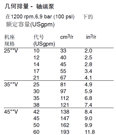 35,38,45備注:1、排量代號是在1200r/min和0.69Mpa(100psi)下的額定USgpm。2、轉速限制:a.最低轉速,所有型號和油液搭配600r/min。b.最高轉速:標準型號用抗磨液壓油1800r/min;標準型號用合成液和油包水乳化液1200r/min;用水乙二醇的型號1500r/min。