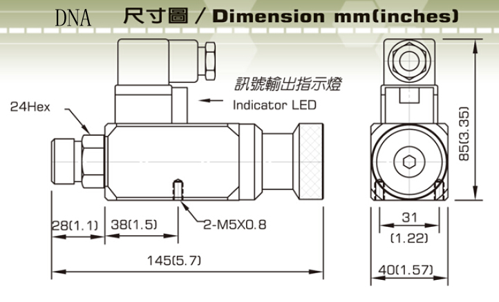 1、壓力繼電器DNA為機械式油電壓力開關,壓力直讀式,標準型,安裝為管式內牙PT1/4",負載:5A-125,250VAC,LOAD:5A,30VDC,0.15A,125VDC。