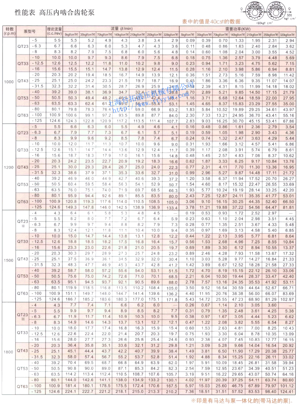 時的功率6P電機 4P電機 6P電機 4P電機 1200rpm 1800rpm 1000rpm 1500rpm QT23-4 250 320 3.0 - 7.5 - 6.4 QT23-5 3.5 6.5 9.8 5.4 8.2 QT23-6.3 4.3 7.9 11.9 6.5 9.9 QT23-8 5.4 9.8 14.8 8.2 12.3 QT33-10 6.8 11.9 17.9 9.9 14.9 QT33-12.5 8.6 15.0 22.6 12.5 18.8 QT33-16 10.6 18.6 28.0 15.5 23.3 QT43-20 13.7 24.1 36.3 20.0 30.2 QT43-25 16.8 29.9 45.0 24.8 37.4 QT43-31.5 21.6 38.5 57.9 32.0 48.2 QT53-40 26.1 45.7 70.3 38.9 58.5 QT53-50 33.5 60.3 90.6 50.2 75.5 QT53-63 41.9 75.9 114.0 63.2 95.0 QT63-80 52.7 95.6 143.7 79.6 119.7 QT63-100 66.1 120.3 181.2 100.4 150.9 QT63-125 81.3 149.0 223.8 124.1 186.4 備注1:本表用于大概的選擇QT泵型號,泵的詳細內容請再參照泵的性能表,還有表中的所需功率N(kw)是在1500rpm額定壓力時的值。