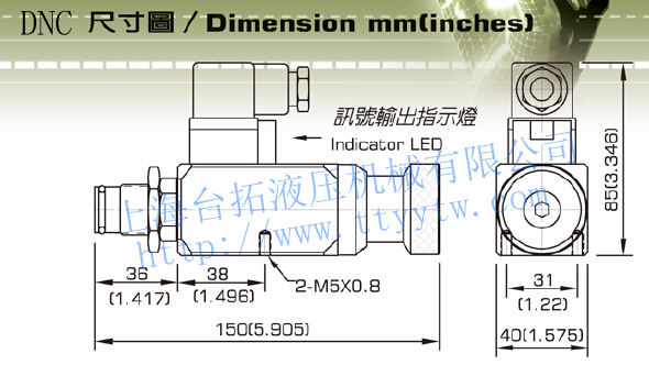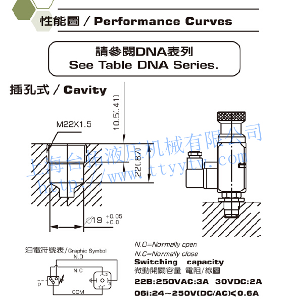 壓力繼電器DNC為機械式油電壓力開關,壓力直讀式,插式型,油路承制閥孔,直接插入安裝,螺牙式M22×P1.5直入油路集成塊,減少系統(tǒng)泄漏機會,負載:5A-125,250VAC,LOAD:5A,30VDC,0.15A,125VDC。