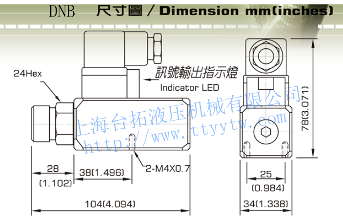 壓力繼電器DNB一般型,接管口徑:1/4" PT(PF,NPT)內(nèi)牙,負(fù)載:5A-125,250VAC,LOAD:5A,30VDC,0.15A,125VDC。