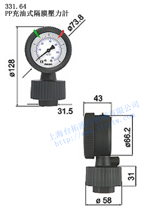 2、PP充油式隔膜壓力表331.64由于一體成型的構(gòu)造,不易產(chǎn)生裂痕以及漏油現(xiàn)象,且具抗腐蝕性。