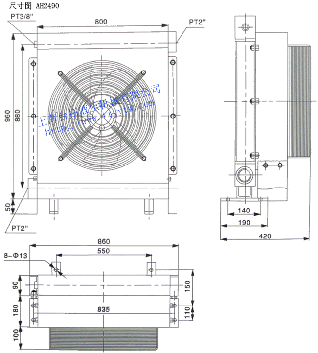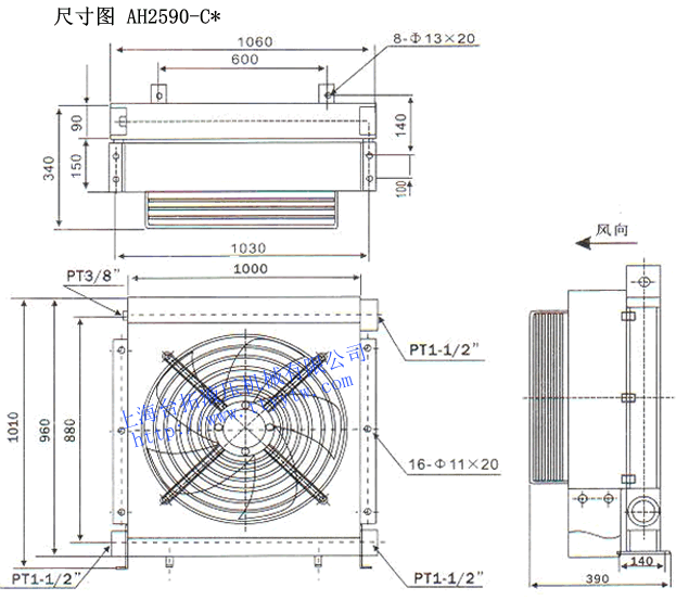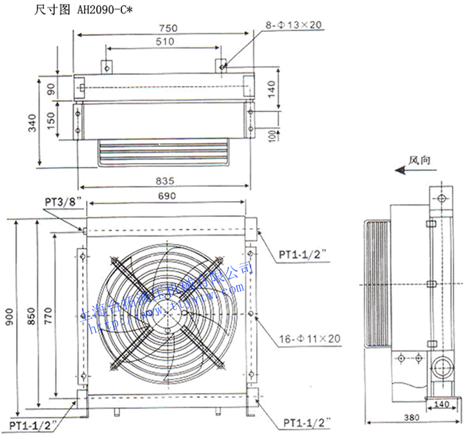 型號 牙口(PT) 通過量?/min 工作壓力Mpa 風扇功率W 重量Kg AH2090-CA 1 1/2" 400 ≤2 600 80 AH2290-CA 1 1/2" 450 800 150 AH2490-CA 2" 400 700 110 AH2590-CA 1 1/2" 500 900 110 風冷機AH2系列外形尺寸圖
