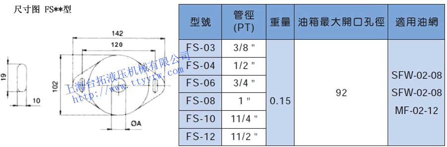 型號 管徑(PT) 重量 Kg 油箱最大開口孔徑 適用油網 FS-03 3/8" 0.15 92 SFN-02-08