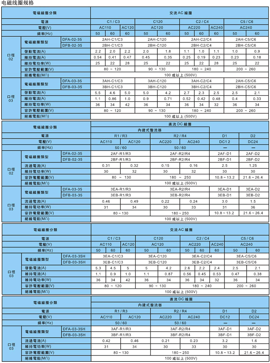 型號 DFA/B/C-02-35(C)系列 DFA/B/C-03-35(H)系列 標準型 液壓緩沖型 標準型 液壓緩沖型 交流 直流及RAC型 閥軸型式 最高工作
