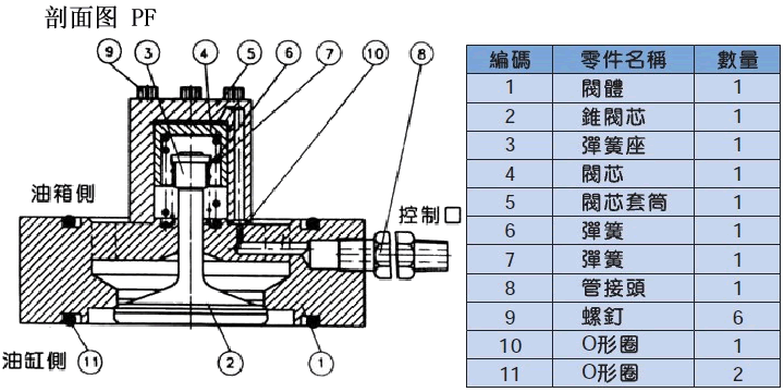 法蘭型充液閥PF一般作為液壓缸和油箱間的吸排油閥使用,大型壓力機的快進行程,要從油缸向油箱吸油,加壓時防止從油缸流入油箱,反向時從油缸排油到油箱。