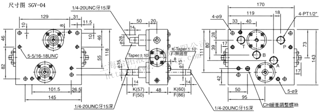 型號 最大流量?/min 最大壓力MPa 口徑 臺面 SGV-04-25 40 4 PT 1/2" 400×800 機械式方向閥SGV-04尺寸圖