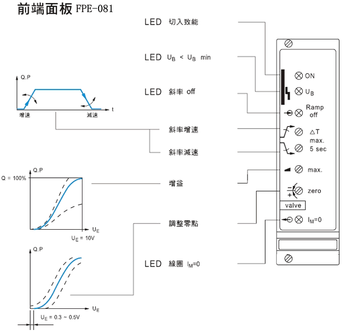 2、斜率使用注意事項:適當附屬電位計設定斜率上開(加速)和斜率下降(減速)。斜率ON,若b 20是開。斜率OFF,若U>6V在b 20,即10V來自b 22。斜率OFF,當回路中斷進行中的斜率時,會出現(xiàn)一個不連貫的過渡信號輸出值。比例閥控制器FPE-081前端面板