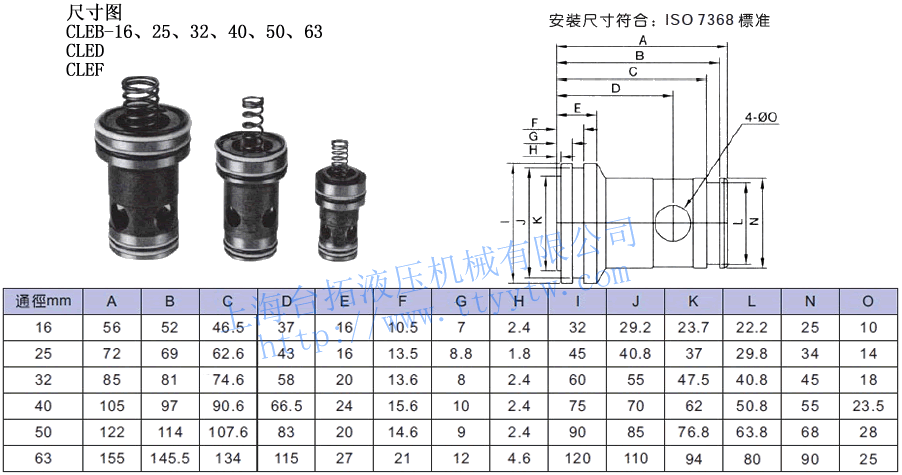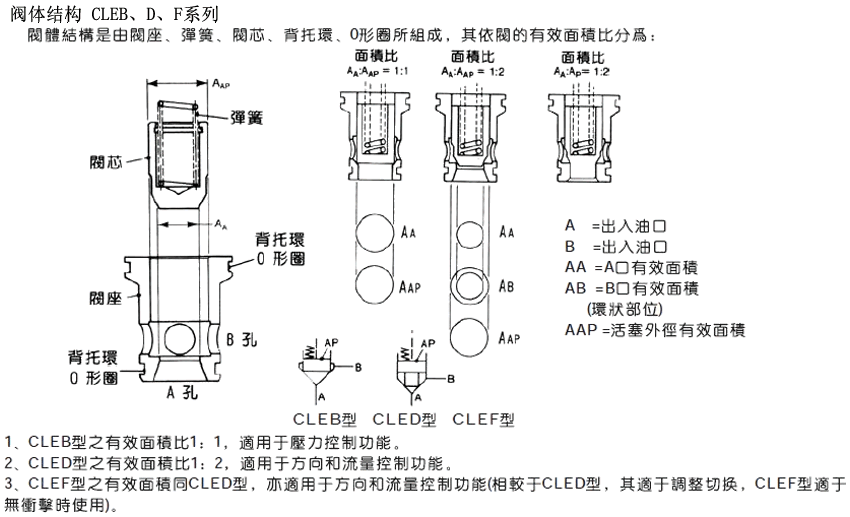 50:0.525:350?/min 32:500?/min 40:850?/min 50:1400?/min 63:2100?/min 直入式插裝閥CLEB,CLED,CLEF閥體結構