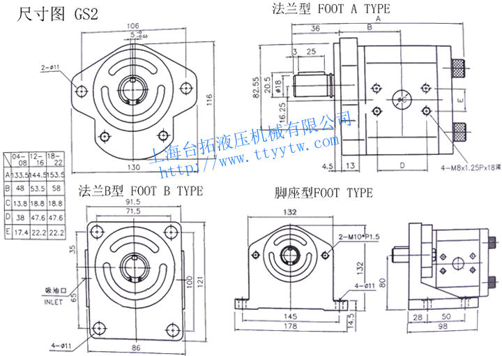 kg出口 入口 最低 最高 腳座型 法蘭型 GS2-04 280 4.5 1/2" 1/2" 900 3200 10.5 8.5 GS2-06 6.5 GS2-08 8.6 GS2-12 12.1 3/4" 3/4" 500 2700 11.5 9.5 GS2-14 14.8 GS2-16 16.2 GS2-18 230 18.6 2000 12 10 GS2-20 20.7 GS2-22 22.4 定量齒輪泵GS2尺寸圖